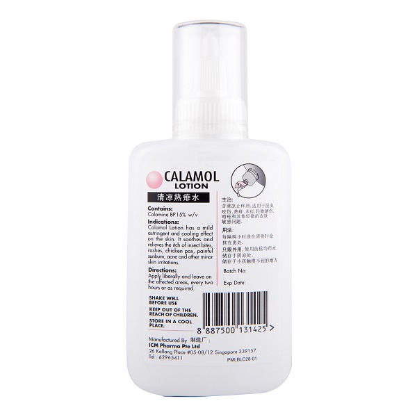 Calamol lotion has a mild astringent and cooling effect on the skin. It soothes and relieves the itch of insect bites, rashes, chickenpox, painful sunburn, acne and other minor skin irritations.