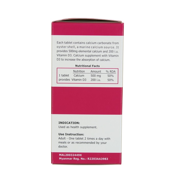 Each caplet contains 1250mg of calcium carbonate and 200iu Vit D3…equivalent to elemental calcium 500mg