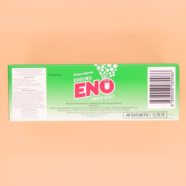 Dosage: Adults and children aged 12 years and over (1 sachet of ENO fruit salt in a glass of water).