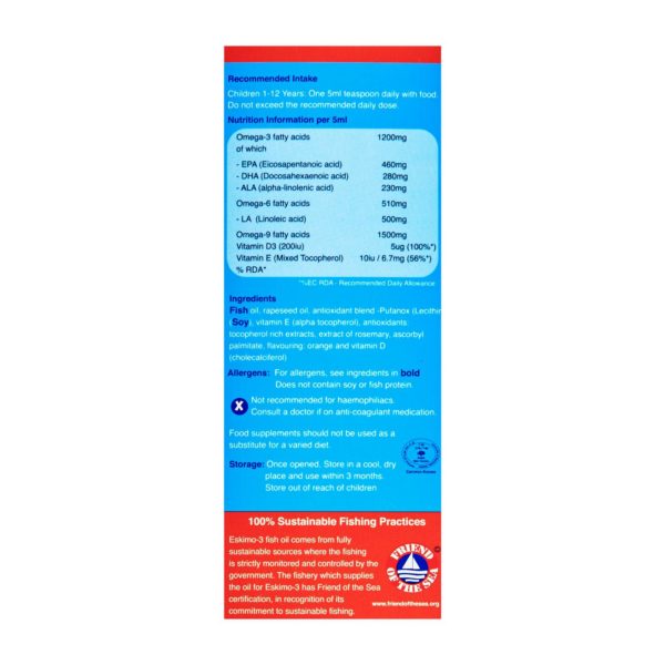 Specifically formulated to give children the right balance of omega oils. A children’s pure and stable omega-3 fish oil with GLA and vitamin D. Vitamin D, for healthy bone development. Suitable for age 1 to 12 years old. Orange flavour.