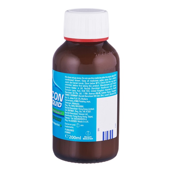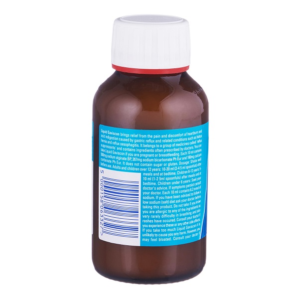 Check that the cap seal is unbroken before first taking the product. Each 10ml contains Sodium Alginate BP (500mg), Sodium Bicarbonate Ph Eur (267mg), Calcium Carbonate Ph Eur (160mg). It does not contain sugar or gluten.