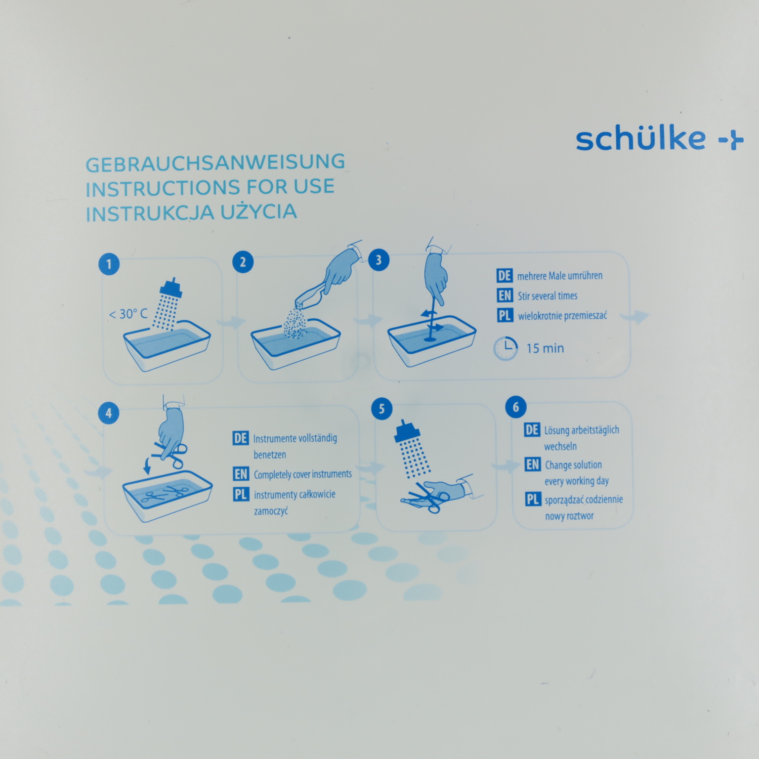 Active oxygen-based instrument disinfectant for manual cleaning and disinfection with a multi-enzyme formula. Full microbiological effectiveness via its synergistic combination of active substances plus active oxygen (concluding virucidal disinfection with 2% in 10 minutes). Outstanding cleaning performance via its multi-enzyme formula (protease, lipase and amylase) in combination with a neutral pH (non-protein-fixing) and powerful surfactants