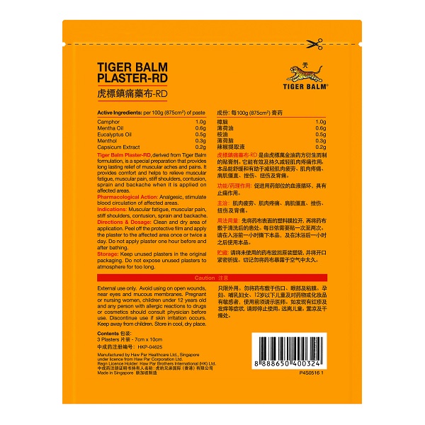 Tiger Balm Plaster (Warm) is a unique preparation that provides long-lasting, soothing relief for stiff necks and muscular aches and pains. It is comfortable and an effective remedy for stiff neck and shoulders, back pains and muscular fatigue.. For neck, arms, legs and joints
