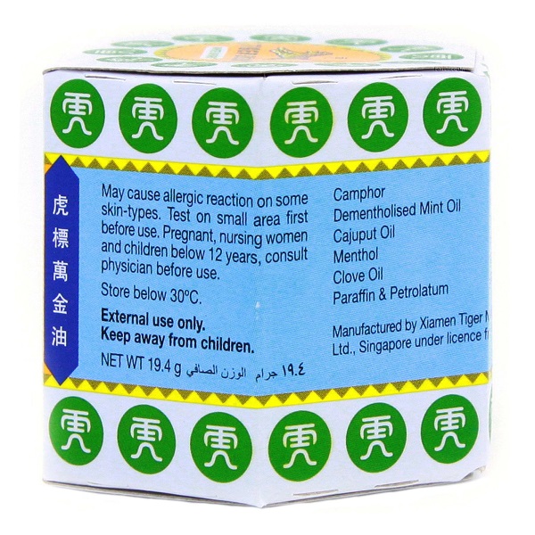 Active ingredient: Camphor 25.0%. Dementholised Mint Oil 16.0%. Cajuput oil 13.0%. Menthol 8.0%. Clove oil 1.5%. Paraffin & petrolatum.